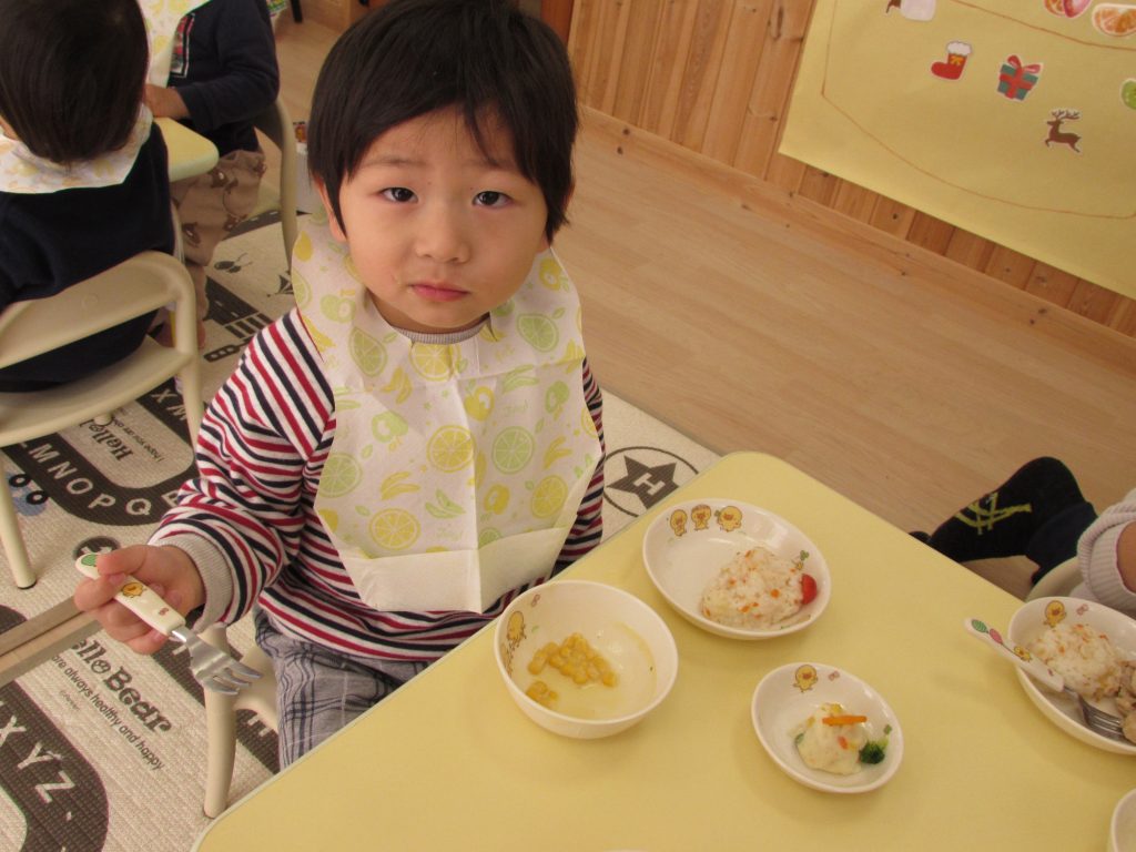 給食ではトナカイピラフやポテトツリーサラダを食べて